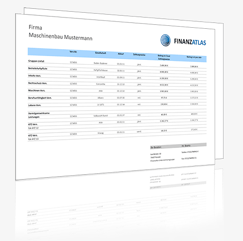 Der Versicherungspilot gibt Ihnen einmal jährlich einen Überblick über Ihre sämtlichen Versicherungen. Beitrag, Laufzeit, Versicherer, Versicherungsnummer und Art der Versicherung werden transparent dargestellt. Dies gilt auch für Verträge, die nicht von uns vermittelt wurden.